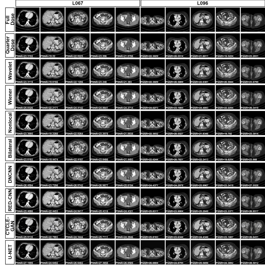 In the test phase, 50 exclusive quarter-dose and full-dose CT test images were used. The quarter-dose versions of the CT test images were fed to the proposed U-NET, as well as three more state-of-the-art DL-based algorithms and four classical image enhancement methods. The resultant images were saved for quantitative, qualitative, and comparative analysis. Figure 3 show full-dose, quarter-dose and enhanced versions of the CT test scans in columns.